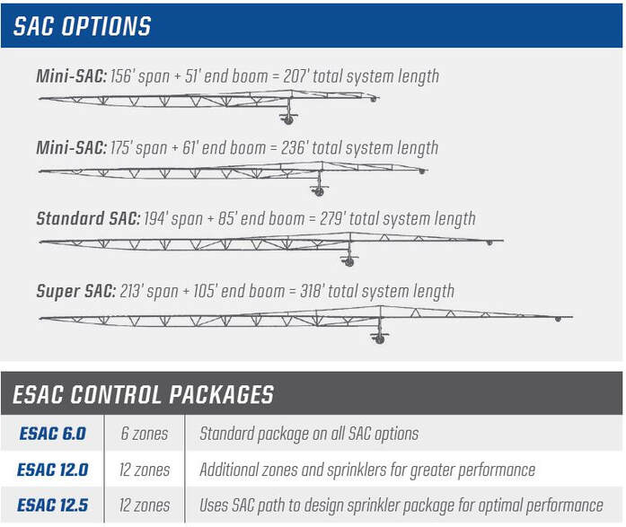 SACs are available in a variety of sizes from the Mini-SAC with a total system length of 207 feet to the Super SAC with a total extended length of 318 feet. SACs can be configured as either a leading or trailing swing arm position as needed to increase the number of irrigated acres in part-circle applications. The Mini-SAC is the shortest in the industry, and the Super SAC is the longest.